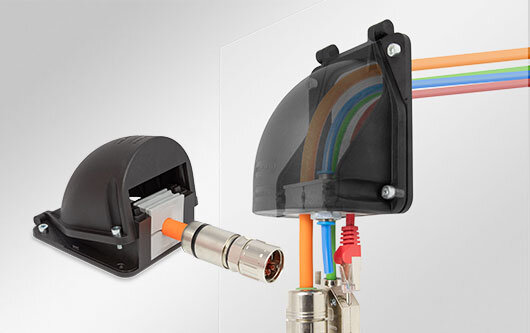 KT grommet based bulkhead for 90° preassembled cable transit for cable diameters up to 35 mm and a large bending radius (r max. = 150 mm).
